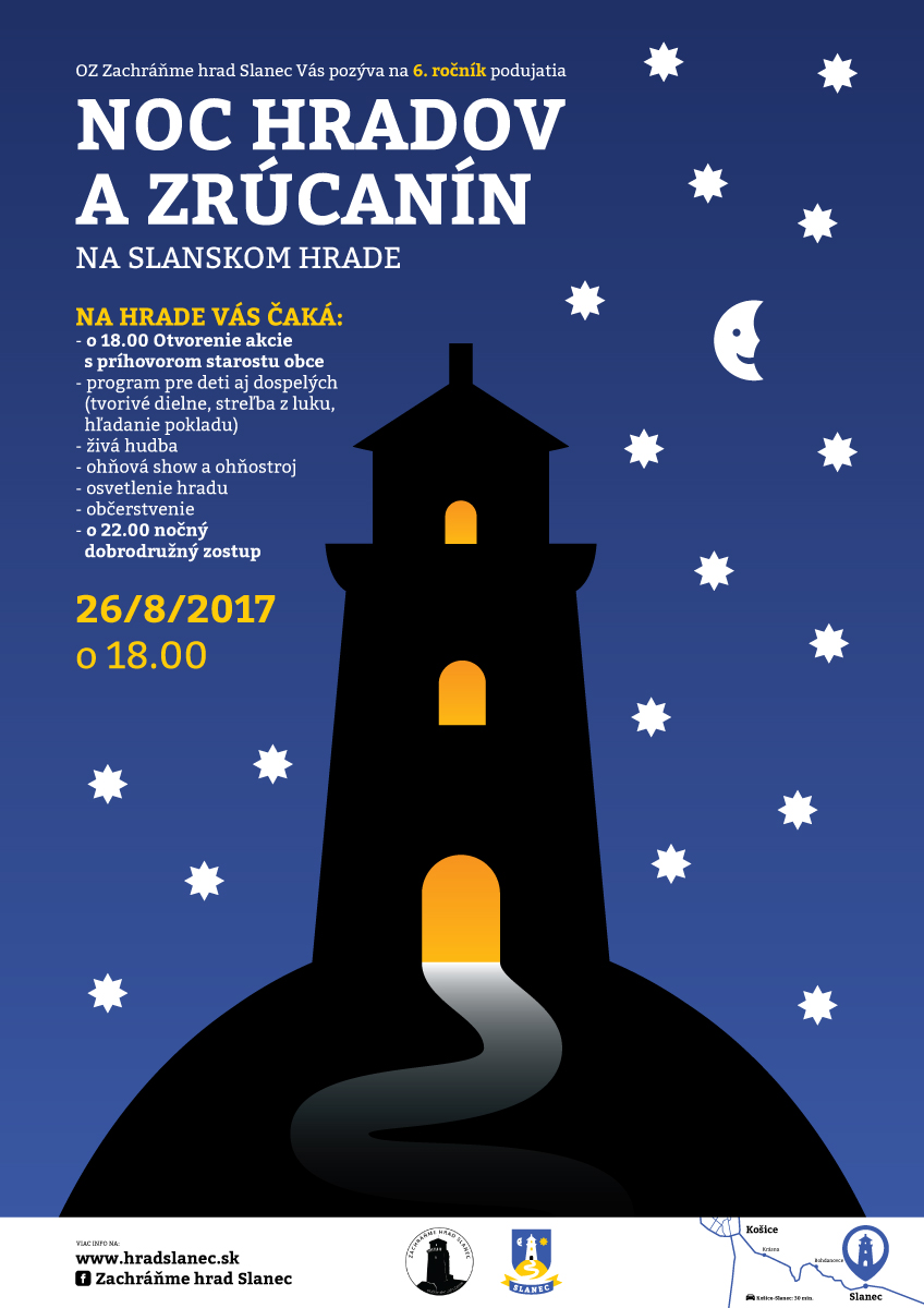 Opäť sa zapájame do celoslovenskej akcie Noc hradov a zrúcanín. Šiesty ročník sa bude v Slanci konať v sobotu 26. augusta. Pozývame vás na hradný vrch vychutnať si jedinečnú atmosféru a dobrodružný nočný zostup. Program nájdete na pozvánke nižšie.
