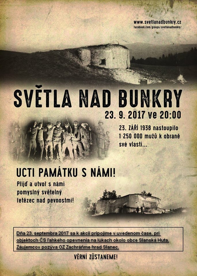 Akcia pod názvom “Svetlá nad bunkrami – mobilizácia” sa uskutoční aj tohto roku a to v sobotu 23. septembra. Osvetľovanie objektov ČS opevnenia okolo “celej ČSR” sa začne o 20-tej hodine.